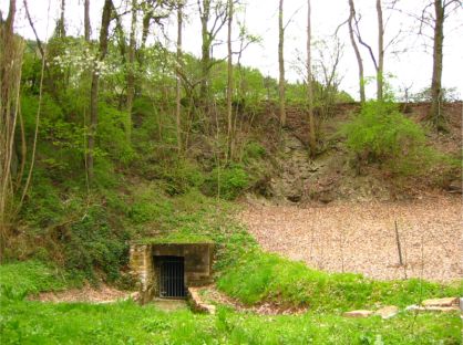 Steinbruchgelände, an dessen Felsabbruchkante der Eingang des Eiskellers