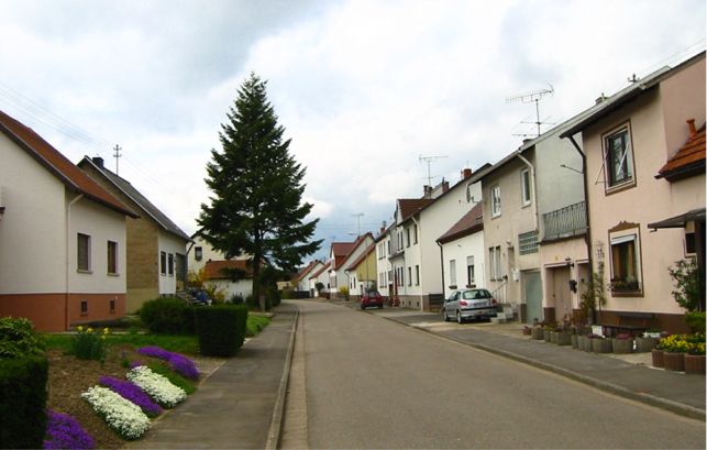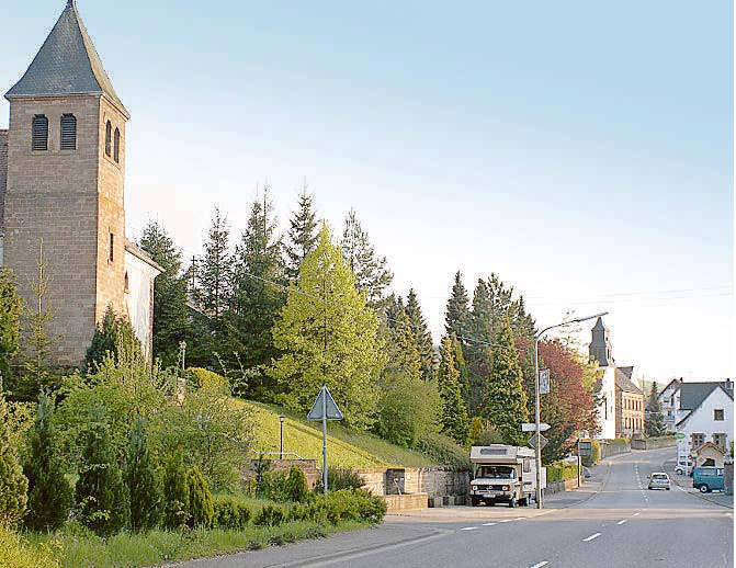 Hauptstraße von Bliesdalheim mit der Ansicht der katholischen Kirche