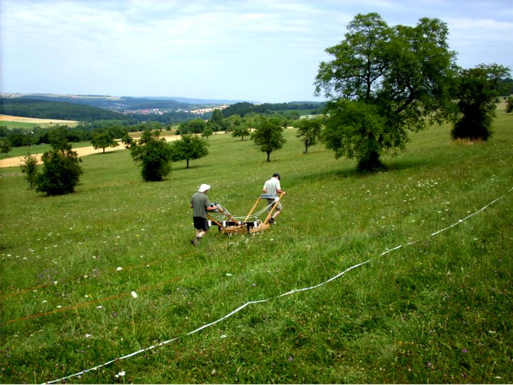 Im Juli hat ein Archäologen-Team begonnen, die römische Anlage in den „Heizwiesen“ oberhalb des Dorfes geophysikalisch zu prospektieren. Die dabei durchgeführten Messungen sollen weitere Aufschlüsse darüber geben, wie weit sich der antike Gutshof erstreckte und welchen Grundriss die Baustrukturen aufweisen. Im Jahr 1888 führte der Historische Verein der Pfalz aus Speyer eine Ausgrabung in der Flur „Heizwiesen“ durch, welche sich oberhalb des Dorfes am Hang des Kahlenberges befindet. Bei der Grabung wurden Mauerreste von vier Gebäuden aufgedeckt, deren Grundriss allerdings unvollständig ist und viele Fragen aufwirft. Lediglich ein Bau konnte nahezu vollständig freigelegt werden, wobei es sich um ein Badegebäude handelt, welches u.a. ein Kaltbad, Fußbodenheizung und eine Latrine aufwies. Das geborgene Fundmaterial gibt leider keine Auskunft über die Entstehungszeit der Anlage, doch belegt es deren Existenz bis mindestens ins 4. Jahrhundert hinein. Im Rahmen eines Forschungsprojektes zur gallo-römischen Besiedlung im Bliesgau und Nordostlothringen rückte auch die Anlage bei Bliesdalheim wieder in den Fokus der Wissenschaft. In den vergangenen Jahren erfolgten mehrere Begehungen der Flur, bei denen oberirdische Geländemerkmale dokumentiert wurden. Dabei konnte ein Gebäudeschutthügel mit einem Mindestdurchmesser von 35 m, kalksteinernen Mauersteinen, Kalkmörtel, Dachziegel- und Sandsteinfragmenten postuliert werden, unter dem sich das Hauptgebäude des Gutshofes verbergen könnte. Weiter unterhalb befinden sich zwei künstliche Geländeterrassen, die in einer Flucht mit dem Gebäudeschutthügel verlaufen und daher ebenfalls bereits in römischer Zeit, oder aber im Zuge neuzeitlichen Ackerbaus entstanden sein könnten. Die mit dem Auge beobachteten Geländeeingriffe wurden durch die Auswertung einer Laser-Befliegung (LIDAR-Scan) des Geländes bestätigt. Zusammen mit den Beobachtungen bei Bohrkernentnahmen kann für die Villa rustica eine Mindestgröße von etwa 2,5 ha nachgewiesen werden.
